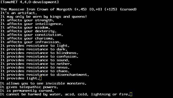 - 아티팩트, 아티 (Artifact, Art) : 각종 옵션이 붙어 있는 강력한 아이템. 특별한 이름이 붙어 있음. 아티팩트는 두 종류가 있는데 일반적으로 아티팩트라고 하면 대개 스탯이 고정되어 있는 고정(Fixed) 아티팩트를 주로 지칭함. 매뉴얼에 True Art 라고도 표현 되어 있음. 고정 아티팩트는 서버에 하나씩만 존재하는 유니크적 특성이 있음. 예를 들어 Phial of Galadriel 타인이 갖고 있다면 그 사람이 죽거나 버리기 전까지 다시는 다른 사람에게 나오지 않음. 하나씩 밖에 없기 때문에 남용 방지를 위해 집에 보관되지 않음. 또한 고정 아티팩트는 아이템의 레벨 제한보다 낮은 캐릭터는 줍는 것조차도 불가능함.